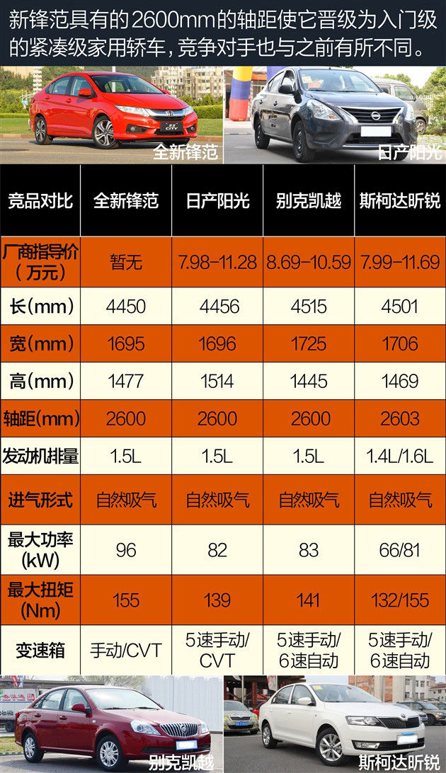 别看新锋范仅仅把轴距增长了50mm,但细微的变化也把它的身份晋级为入门级紧凑型家用轿车,而其竞争对手也随之改变。相比之下,新锋范搭载的地球梦1.5L发动机在动力参数上有着明显优势。