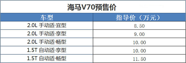 海马V70预售开启 首发价8.5-11.5万元