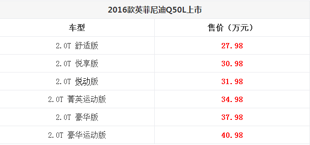 东风2016款英菲尼迪Q50L正式上市 售价为27.98~40.98万元