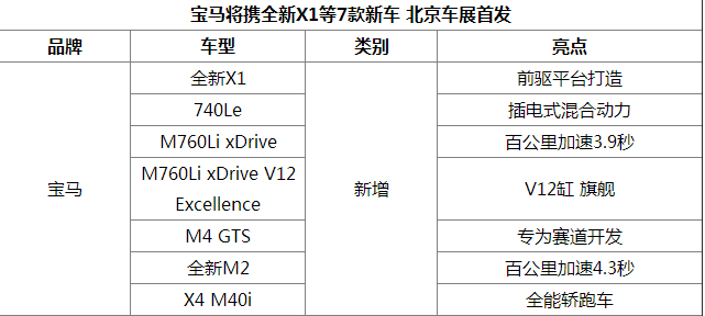 天翼汽车从宝马集团官方了解到,宝马将在北京车展上携多款新车型亮相,包括即将全球首发的全新紧凑级SUVX1,宝马7系(参配、图片、询价) 插电式混合动力车型以及全新入门级双门轿跑车M2等。