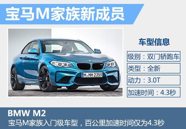时隔5年,宝马即将在今年的北京车展带来M家族全新入门级双门轿跑车。宝马M2将采用后轮驱动,搭载一台3.0升直列六缸涡轮增压发动机,额定功率为302千瓦。另外,宝马M2还具备超增压模式,短时超增压模式下峰值扭矩可以激增至500牛米。与发动机匹配的是一款7速双离合变速箱,新车的0-100公里加速时间为4.3秒,百公里油耗8.1升。