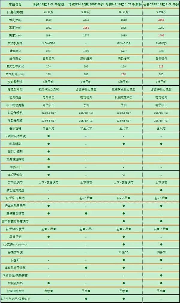 所以尽管官方调性很高,但真正明智的办法,还是找同班小伙伴们一起玩儿比较好。在上市之后的报道里,像传祺GS4、哈弗H6、长安CS75等热销车型就被媒体们拎出来解析了。选定竞争对手之后,吉利博越就得拎出一些东西来烘托其产品力。为了营造高性价比的形象,吉利博越全系配备了EBD、ESP车身电子稳定系统、BA刹车辅助系统、TCS牵引力控制系统以及像车顶行李架、一键启动、自动空调等逼格配置。 这些东西看起来都很棒,但瑕不掩瑜的看,无论其定价、尺寸还是动力等方面,博越都不是一款可以全面胜出的产品。