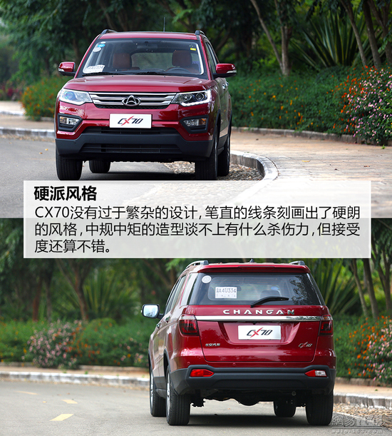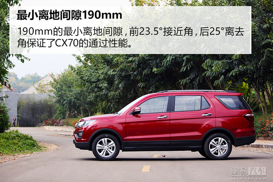 在车型配置上。笔直硬朗的线条也同样让它显得高大,从侧面看也颇有硬派越野的味道,对于中国消费者大即为美的观点,CX70会非常讨巧。同时,CX70考虑到目标用户形 式路况的条件,CX70接近角和离去角的设定已经最小离地间隙都保证了它的通过性能,虽然不能越野,但至少不会托底,这也是它打造成SUV造型的一个优 势。