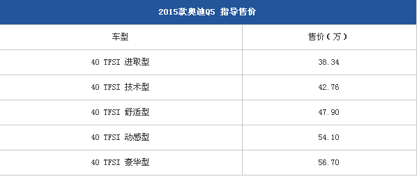 后视镜下方增加了亮黑喷漆,车门把手等位置新增镀铬装饰,Q5 40 TFSI技术型及舒适型配备双色座椅,40 TFSI舒适型及以上车型增配私密玻璃。2016款奥迪Q5取消了原来35.85万的入门款,其他车型价格略有下调。