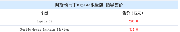 天翼汽车讯 2016北京车展已经正式开幕,阿斯顿·马丁此次也为大家带来了两款重磅打造的限量版车型:Rapide CE和Rapide Great Britain Edition,并且同时公布了售价,价格区间为298.8-318.8万元。