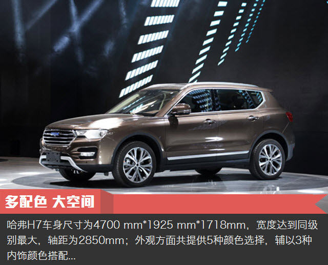 哈弗H7车身尺寸为4700 mm*1925 mm*1718mm,宽度达到同级别最大,轴距为2850mm;外观方面共提供5种颜色选择,辅以3种内饰颜色搭配。