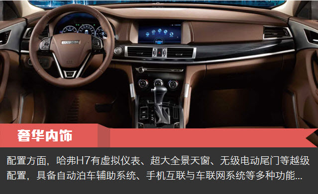 配置方面,哈弗H7拥有虚拟仪表、超大全景天窗、无级电动尾门等越级配置,具备自动泊车辅助系统、手机互联与车联网系统等多种功能。