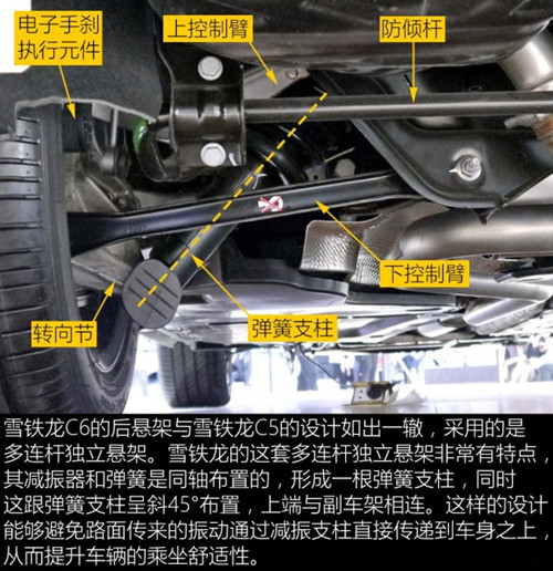 全新雪铁龙C6的底盘结构与现款雪铁龙C5大致相同。特殊的后悬架设计是为了增强车辆乘坐舒适性的。可以预见,该车将会延续雪铁龙C5悬架系统滤振性能的优势,为车内乘客提供更舒适的驾乘体验。