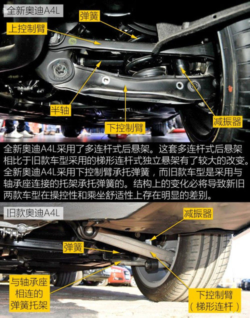 全新奥迪A4L相比旧款车型来说,换用了全新的后悬架系统。这将使得新车拥有不一样的操控特性。底盘做工方面,新车保持奥迪产品一贯的高标准,在细节方面做得较为到位。