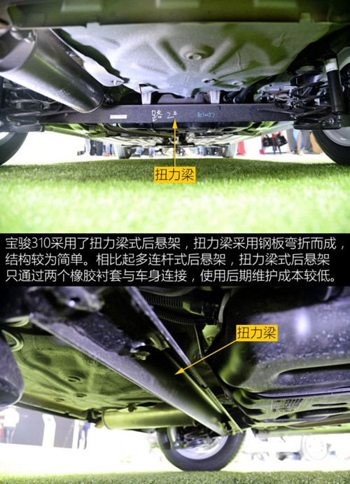 宝骏310的竞争对手是奇瑞风云2和长安CX20,所以其定价预计在4-6万区间内。受制于制造成本的限制,该车悬架系统上大多采用的是钢制材质部件,扭力梁也没有采用性能更好的变截面设计。而该车底盘防护方面的配置还是比较厚道的。
