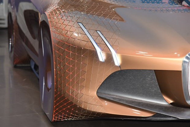 宝马VISION NEXT 100概念车是一款造型十分独特的车型,这款车车身前后轮拱处类似鳞片的设计一定能吸引很多人的眼光,不过其不仅仅是简单的装饰。因为这款车采用了封闭式的车轮罩,所以车辆转弯时鳞片会与车轮和轮罩随动,相当科幻。