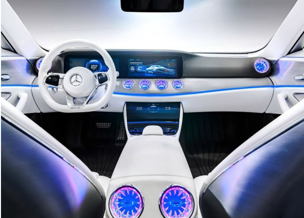 内饰方面,奔驰IAA概念车采用环抱式内饰设计,具有四个独立的座椅,配备有数字虚拟仪表盘和中控台显示屏,空调控制区域则拥有独立的显示屏,所有的操作均通过触控的方式完成。