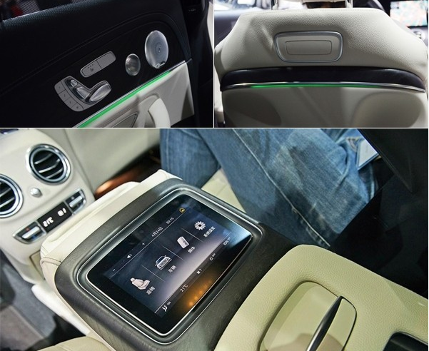 全新E级的车厢氛围灯有64种变化,电动座椅的按钮也集中在后门上。后排其实最大的玄机藏在了中央扶手。将中间座椅放倒变成中央扶手后,就会发现上面有一块液晶屏,新E级长轴版把后排乘客的中控做成了触屏,这一招真的是豪华感与科技感兼备,据说这一项配置也是中国版专属。