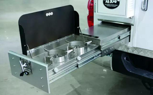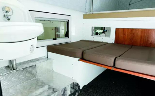 然而让坦途自成一派的并非是底盘悬架系统,而在于优秀的功能延展性。在勇达行皮卡基地,他被改造成了一台功能全面的旅居式房车——只需按动遥控器,车厢内的四个液压挺柱同步举升拓展,缓缓地将一个高度为2.2米,长度为4米的现代化家庭呈现眼前。尽管坦途的承载区城面积并不大,但经过巧妙设计,三人床、电视、空调、马桶、淋浴区应有尽有。抽屉式移动厨房系统内置双头气炉,在户外也能烹饪美味佳肴。