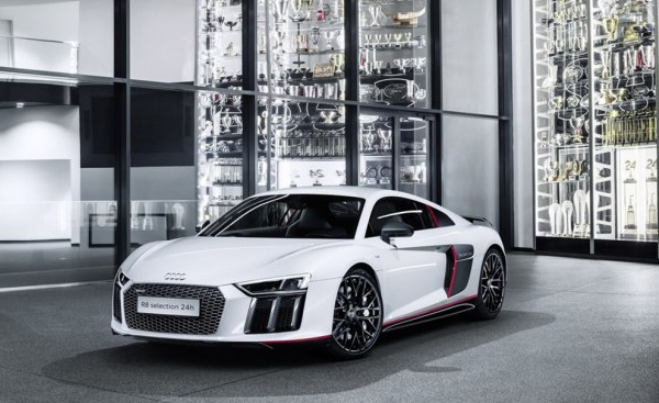奥迪R8 V10 Plus selection 24h特别版车型的推出是为了纪念2015年奥迪在纽伯格林24小时耐力赛中夺冠,同时,也是向自2009年以来奥迪R8 LMS共取得的323场胜利致敬。新车在外观方面采用了专属的车身涂装,并在局部细节融入了红色元素点缀,而“R8 24h”的车身LOGO也彰显了其特殊的身份。