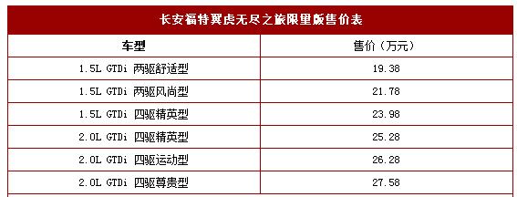 天翼汽车讯 近日,天翼汽车小编从相关渠道了解到,此次福特翼虎将全面推出无尽之旅限量版车型来增加市场竞争力,该车售价继续在19.38-27.58万之间,不过配置却有所提升,所谓加量不加价哦。请看,具体售价表: