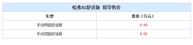 天翼汽车讯 近日,天翼汽车从哈弗官方了解到,哈弗H2舒适版车型目前已经正式上市了,该款车型包括手动两驱舒适版和手动四驱舒适版两款车型,售价分别为8.88万元和9.68万元。下面请看更详细的介绍。