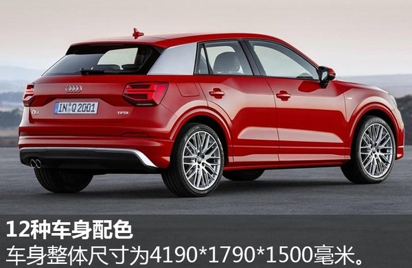 奥迪全新Q2的车身整体尺寸为4190*1790*1500毫米,整备质量约为1205公斤,C柱较宽,营造出类似“悬浮式”车顶的风格。新车共有12种车身颜色和两种车顶颜色供消费者选择,同时提供有16至19英寸不同大小的铝合金轮毂。新车共有5种驾驶模式,而在越野模式下,车辆的底盘将提高至200毫米,通过性有所提升。