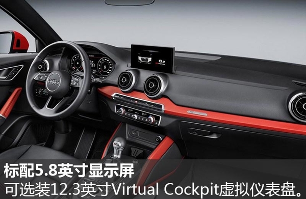 奥迪全新Q2的行李厢容量为405升,后排座椅能够以40/20/40比例放倒,在放倒后新车的装载能力有所提升。新车内部标配5.8英寸MMI影音娱乐显示屏和LED氛围灯,可选装12.3英寸Virtual Cockpit虚拟仪表盘和8.4英寸大尺寸显示屏,同时还可选配无线充电器、智能手机互联系统和Bang&Olufsen音响系统。