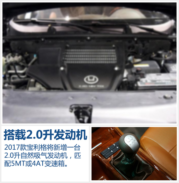 动力方面,2017款宝利格将在原有1.8T动力基础上,新增一台全新的2.0升自然吸气发动机,最大扭矩177牛米。传动系统方面将匹配5MT或4AT变速箱。除此之外,2017款宝利格还将配备车身防抱死系统ABS+EBD、主/副驾安全气囊等安全配置,以保障行车安全。
