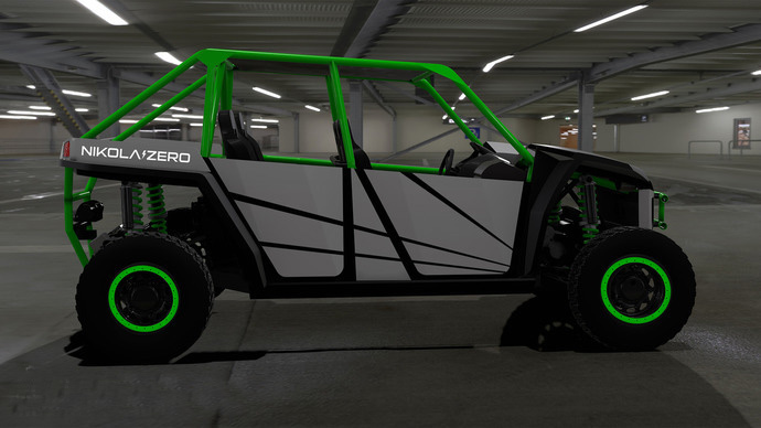 其中,尼古拉ZERO是一款定位于越野玩乐用途的UTV车型,从渲染图上也不难看到尼古拉ZERO采用了框架式的车身,并且拥有外露式的四轮设计,悬挂行程也非常的可观。从外观上来看,这辆尼古拉ZERO几乎和我们常见的普通UTV车型并没有太大的差别。但是在动力方面,尼古拉ZERO搭载了额定输出功率为520马力的电动机,这一输出数值绝对秒杀几乎所有的UTV车型。为其提供动力的锂离子电池组容量为50千瓦时,在越野路况下续航里程为160公里到 240公里之间。得益于强大的动力系统,尼古拉ZERO的零到60英里每小时加速时间则会低于3秒。另外作为一辆UTV,尼古拉ZERO的离地间隙也达到了368毫米。