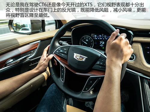 不知道凯迪拉克的设计人员是否将驾驶员的视野感作为所必需优化的项目。无论是我在驾驶CT6还是今天我们试驾的XT5,视野表现都十分出众,特别是设计在车门上的反光镜,既能降低风阻,减小风噪,更能将视野盲区降至最低。