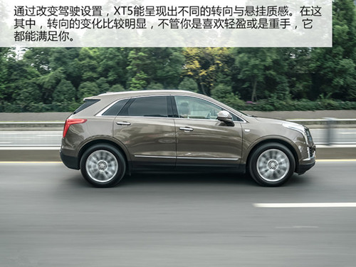 通过改变驾驶设置,XT5能呈现出不同的转向与悬挂质感。在这其中,转向的变化比较明显,不管你是喜欢轻盈或是重手,它都能满足你,在一定程度上能够增强驾驶者的信心。避振系统方面,凯迪拉克XT5并没有采用CT6所搭载的MRC系统,取而代之的是一款我们较为常见的CDC形式的避振管理系统。该系统通过车载行驶信息传感器与避振器内控制油液流动的阀门相配合,实现根据不同车速,加速,路况,实时改变避振系统的当前特性。不过,在半天的常规公路上驾驶,这种不同的回馈感觉确实很难像MRC系统那样敏感直接,但值得欣慰的是,对于一台并不瘦小的SUV车型而言,它悬挂的整体支撑性还是相当不错的。