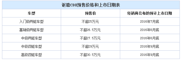 天翼汽车讯 近日,天翼汽车小编了解到了国产讴歌CDX的预售价格,其中,入门级车型售价应该不会超出25万,顶配车型也不会超过30.5万,另外,还了解到,新车会推出5款车型供消费者选择。详细情况可参考下表: