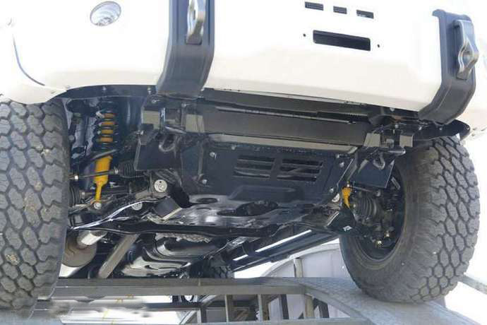 和普通版相比,该车采用了接近角更大的金属材质前保险杠,并内置有牵引力达10000磅(约4.5吨)的美国沃恩电动绞盘。黑色塑胶轮眉让车身侧面看起来更粗犷,同时可对翼子板起到很好的保护作用。进气口几乎和车顶持平的涉水器,可将涉水深度增大至1.6米,达到了专业越野赛车的水平。坚固的侧杠既可对车身侧面提供一定的防护,也让乘客上下车可以更方便。