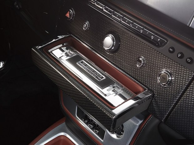 新车中控台抽屉被设计来放置纪念品,内部有一个抛光铝制礼品盒,上面有每辆车的编号,盒内装有该车的信息卡片,包含有这款车金属的来源地等。
