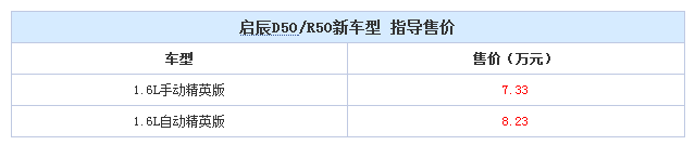 其中,启辰D50/R50、R50X各新增了两款精英版车型,分别为手动精英版和自动精英版。新增车型的售价分别为:D50/R50 1.6L手动精英版售价均为7.33万元,D50/R50 1.6L自动精英版售价均为8.23万元;R50X 1.6L手动精英版售价为7.70万元,R50X 1.6L自动精英版售价为8.60万元。