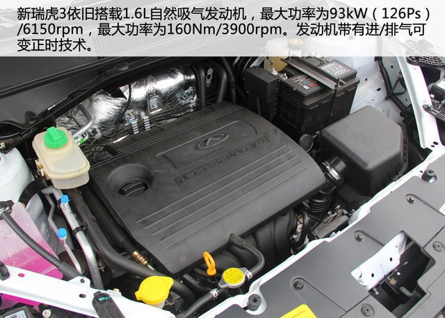 动力方面,新瑞虎3依旧搭载1.6L自然吸气发动机,最大功率为93kW(126Ps)/6150rpm,最大功率为160Nm/3900rpm。传动方面则匹配的5速手动变速箱,同时还有一款可模拟7速的CVT无级变速箱可供选择。