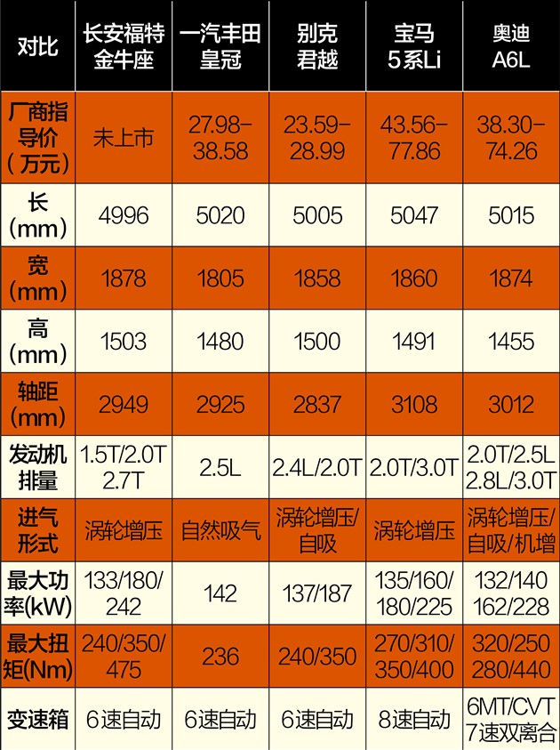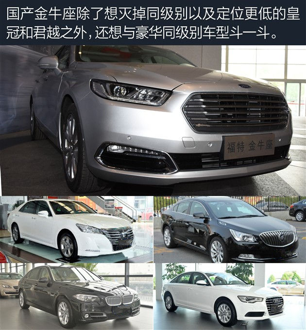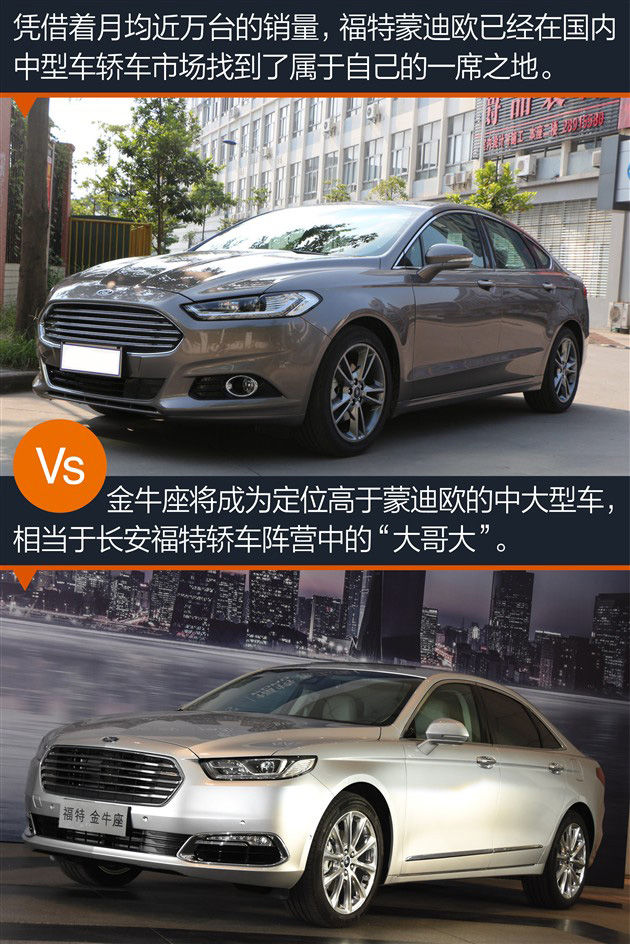 全新金牛座入主长安福特旗下之后,在售销量和关注度颇高的蒙迪欧就得让出老大的座椅。当然金牛座的野心绝不是为了窝里斗,除了要在自家产品线中赢得旗舰地位之外,它还要搅乱甚至搅混中大型车的市场格局,较为直接的竞品是一汽丰田皇冠,另外捎带手把定位本来就低于自己的别克君越也斩落马下。除此之外,凭借着2.7T车型,金牛座肯定也想和宝马5系Li和奥迪A6L较个劲,其实胜败无所谓,关键是拔高产品形象。