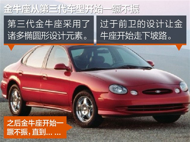不知道是否被金牛座的成功冲昏了头脑,在金牛座出世的第十个年头,福特设计师大胆地将诸多椭圆形设计元素用在了第三代金牛座“身上”,结果迎来了金牛座“人生当中”的低谷,并从此一蹶不振,直到... ...