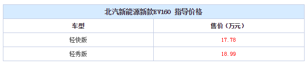 天翼汽车讯 近日,天翼汽车从北汽方面获得新车消息,北汽新能源新款EV160正式上市了,新车包括轻快版和轻秀版两款车型,售价分别为17.78万元和18.99万元,新车相比现款EV160主要在配置方面有所变化。