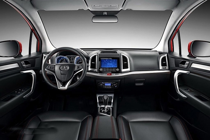 内饰方面:新车内部中控台变化较大,完全放弃了现款的设计。中控台顶部采用独立式显示屏,下方为扁平的空调出风口,中部为控制按键区域。新车中控台还加入了红色的皮质包裹,营造了更加良好的层次感。仪表盘造型也有所改变,由现款的多边形变为了炮筒式仪表盘,增加了内饰的运动感。