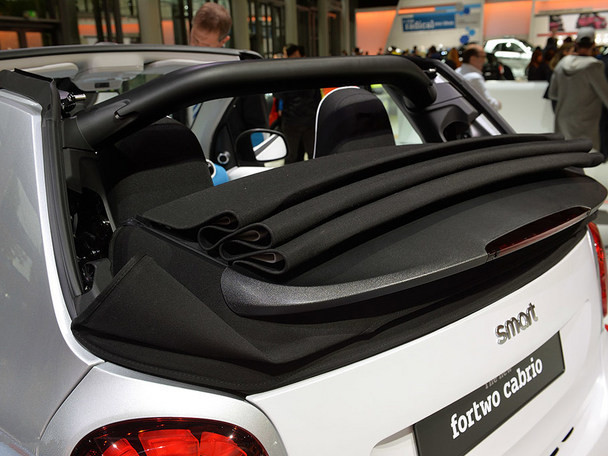 全新smart fortwo敞篷版的长宽高分别为2690/1660/1550mm。车顶结构方面,全新smart fortwo敞篷版车顶采用了帆布材质的可伸缩软篷,只需12秒即可打开。此外,软顶结构面积为1.8平方米,比老款更大,材质采用了高耐光聚丙烯织物,聚酯/棉进行混合,中间辅以橡胶层,总厚度为20mm。