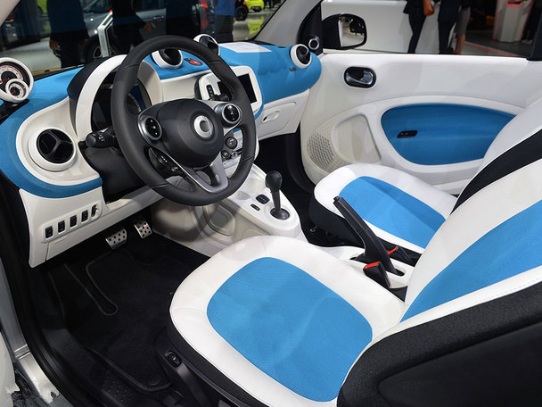 内饰方面,该车内饰拥有纯黑色和黑白相间两种颜色可选。“麻雀虽小,五脏俱全”这句话用在这里最合适不过了,该车配备了三幅式多功能方向盘,中控区域的空调出风口保持了smart原有的特征。另外,该车中央大屏被椭圆形线条包围,显得十分具有活力。