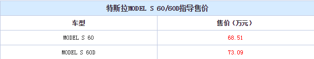 天翼汽车讯 近日,特斯拉正式向市场投放了两款新型车型,分别是MODEL S 60和MODEL S 60D车,当然,作为汽车高档品牌,这两款新型车型的价格自然是不菲的,据悉,两款车型的价格定位分别为68.51万元和73.09万元。详细车型售价请看下表: