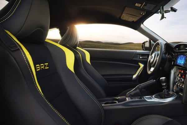内饰方面,新车内部整体采用了黑色配色,并在中控台、座椅及方向盘等部位融入了黄色缝线,同时,该车座椅采用了真皮以及Alcantara材质包裹,亮黄色的BRZ刺绣标识也体现了其特别版车型的身份。