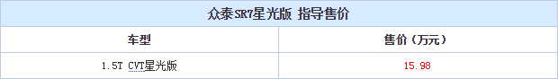 动力方面,众泰SR7星光版继续搭载一台1.5T发动机,最大功率150马力,峰值扭矩为195牛·米,传动系统匹配CVT变速箱。