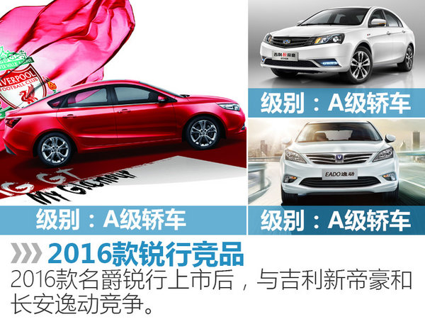 名爵在今年1—4月自主品牌A级轿车细分市场中,吉利新帝豪,长安逸动分别以15,805辆,13,448辆的销量成绩位居销量榜前两位。2016款名爵锐行上市后,与吉利新帝豪跟长安逸动竞争。新车有望凭借更加动感的设计以及丰富的动力选项,取得比现款车型有更好的市场业绩。