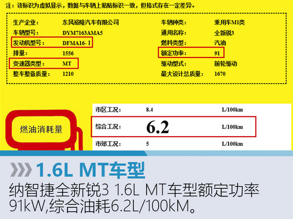 从上述公示信息来看,全新锐3采用前置前驱设计,手动挡车型的整车整备质量为1210KG,而CVT车型略高达到了1250KG。油耗方面,手动挡车型的百公里综合油耗为6.2L,CVT车型是6.3L。单从油耗数据来看,首度使用小排量自然吸气发动机的纳智捷车型解决了此前屡被人诟病“费油”的弊端。