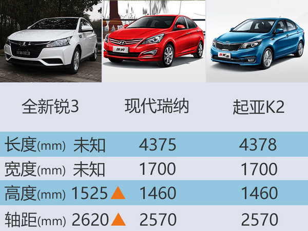 作为一款小型家用车市场的产品,纳智捷全新锐3主要竞争对手是韩系品牌的现代瑞纳、起亚新K2。与其对比,其1525mm的车高和2620mm的轴距,在车身尺寸上是拥有一定优势,可以带来比对手更加理想的内部乘坐空间。