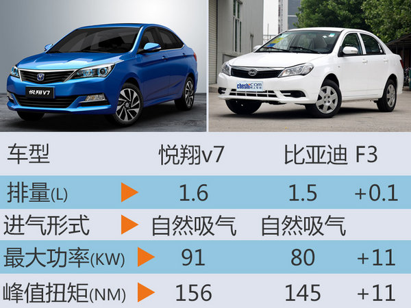 该新车上市后,将与比亚迪F3、吉利远景等车型展开竞争。比亚迪F3搭载6速双离合变速箱,与之相比,该新车在发动机排量上略高于比亚迪F3,最大功率为11千瓦,最大扭矩为11牛米。双离合变速箱的使用将进一步提升悦翔V7的产品在市场上的竞争力。