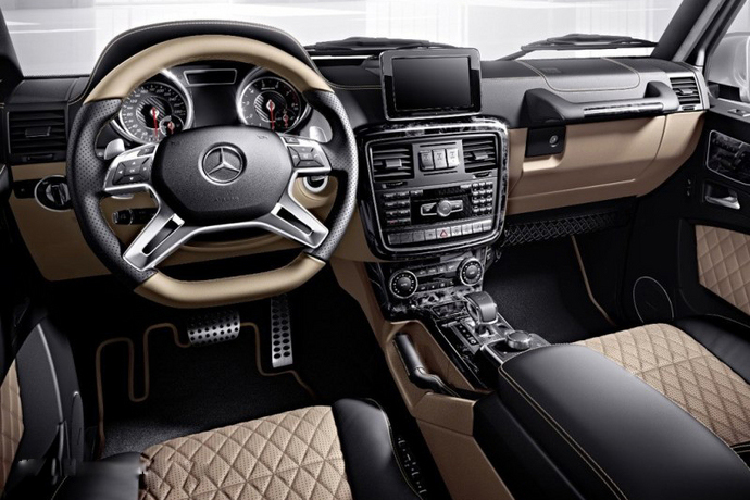 内饰方面:该车还将提供多种内饰颜色及材质搭配,其中在中控台/中控台缝线、方向盘、门板、座椅等部位的皮质颜色可选马鞍棕、深海蓝、丝绸米色及摩卡棕四种颜色。此针对梅赛德斯-AMG G63和G65车型还将额外推出一款DINAMICA内饰选装包,该选装包包括Nappa真皮及DINAMICA超细纤维包裹的运动方向盘,以及 DINAMICA超细纤维包裹的座椅和车顶内衬。