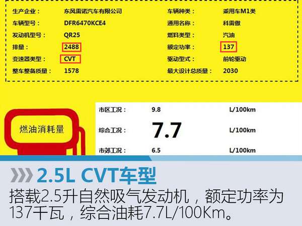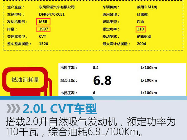 全新一代科雷傲2.0升车型搭载代号为M5R的自然吸气发动机,与国产科雷嘉相同,额定功率为110千瓦,最大扭矩为200牛米。2.5升自然吸气发动机额定功率为137千瓦。