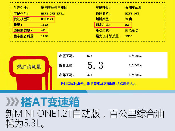 从国家工信部公布的信息可知,新MINI ONE将搭载型号为B38A12A的1.2T增压发动机,匹配AT和MT两款变速箱,百公里综合油耗分别为5.3L和5.2L。这款发动机目前已在现款MINI ONE上搭载,但在全新调校后,最大功率达到了83kW,超越现款1.2T发动机8kW。