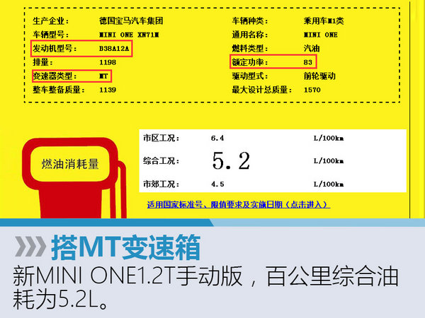 新MINI ONE 1.2T所推出的MT版本的油耗,相对于现款MINI ONE的5.4L/100Km,燃油经济性提升了4%。在提供更佳燃油经济性的同时,MINI ONE车型的动力数值不降反升,这也使其对于消费者的吸引力变得更大。