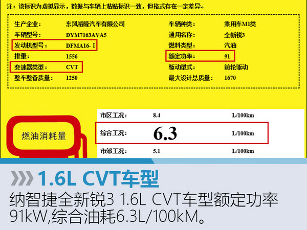 从上述公示信息来看,全新锐3采用前置前驱设计,手动挡车型的整车整备质量为1210KG,而CVT车型略高达到了1250KG。油耗方面,手动挡车型的百公里综合油耗为6.2L,CVT车型是6.3L。单从油耗数据来看,首度使用小排量自然吸气发动机的纳智捷车型解决了此前屡被人诟病“费油”的弊端。